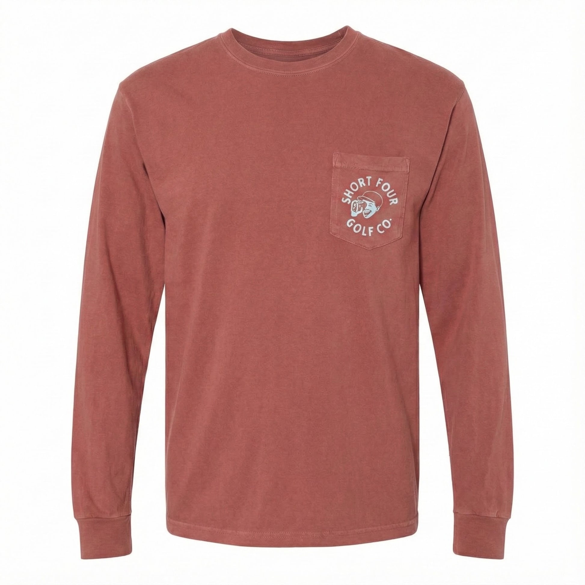 Brick Comfort Colors 100% cotton long sleeve pocket tee, with custom light gray pocket logo