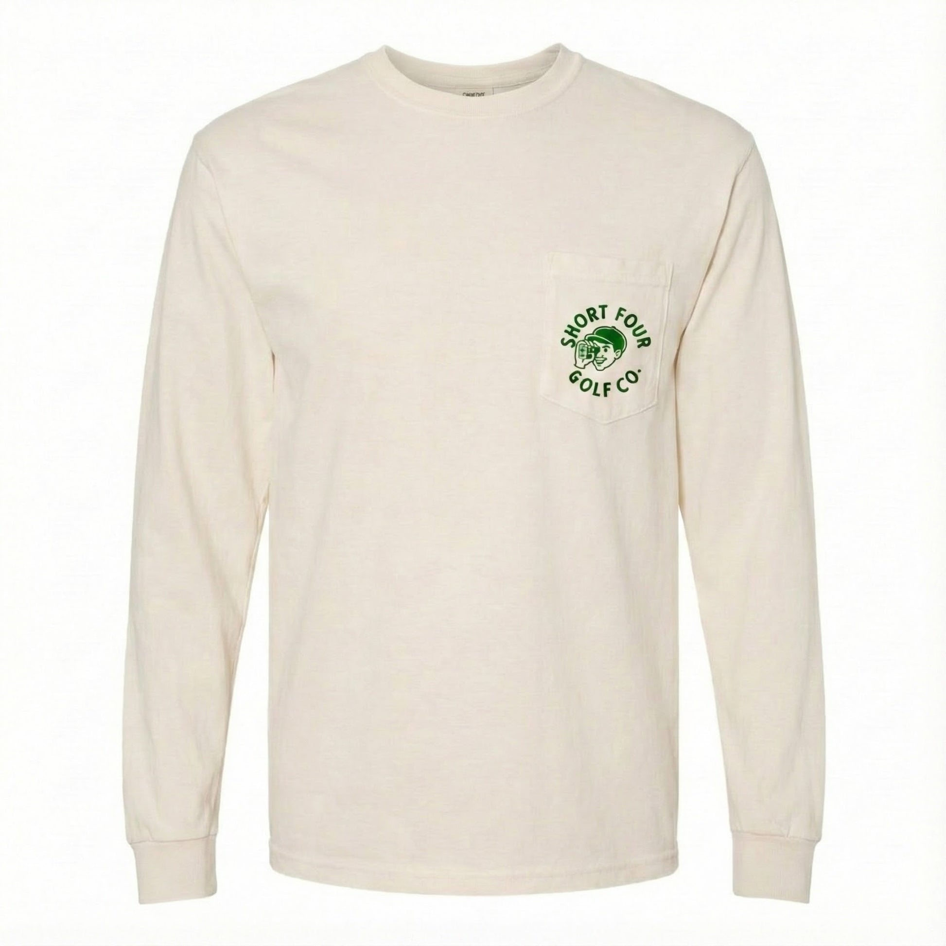 Ivory Comfort Colors 100% cotton long sleeve pocket tee, with custom dark green pocket logo
